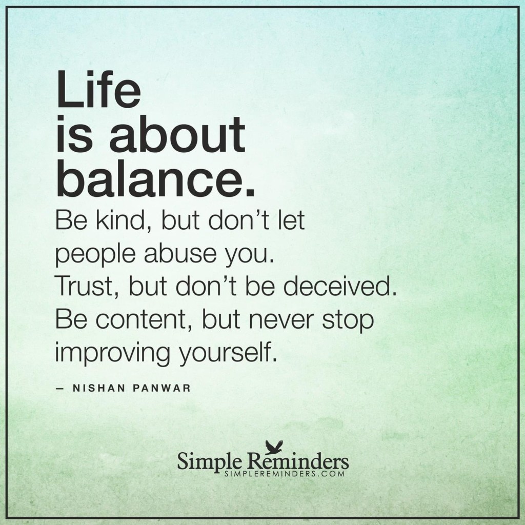 Finding balance in life is an ongoing process that requires self-awareness, wisdom, and adaptability. By being kind, yet setting boundaries; trusting, but not being naive; and finding contentment while continuously improving ourselves, we can navigate life’s challenges with grace and resilience. Embrace the journey, learn from your experiences, and strive to create a life that aligns with your values and brings you fulfillment.