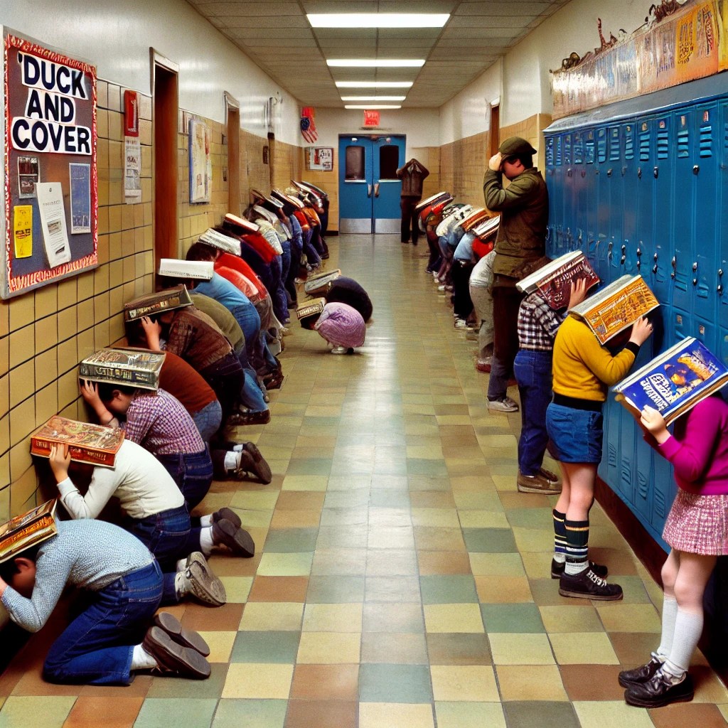 We didn’t have lockdown drills, we had “duck and cover.” And sure, looking back now, there’s something almost absurd about it. Ducking under a flimsy wooden desk or crouching in a school hallway with a textbook over our heads wasn’t going to protect us from a nuclear blast. But that’s what we were told to do. And being kids, we did it. We learned early on that sometimes life hands you absurdity, and you just have to roll with it.